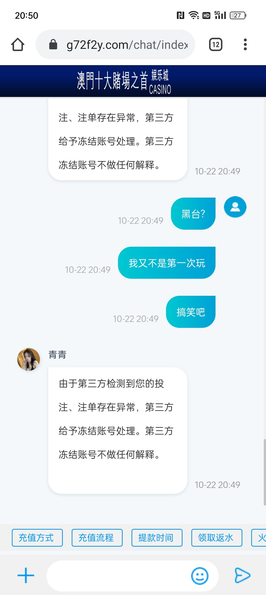 老哥们注意了,打电话我冲100送38,说不限制游戏,我玩麻二到200,去败家哭打到258上不去,就提现,一直不到账,我去问,就是说我注单异常,垃圾