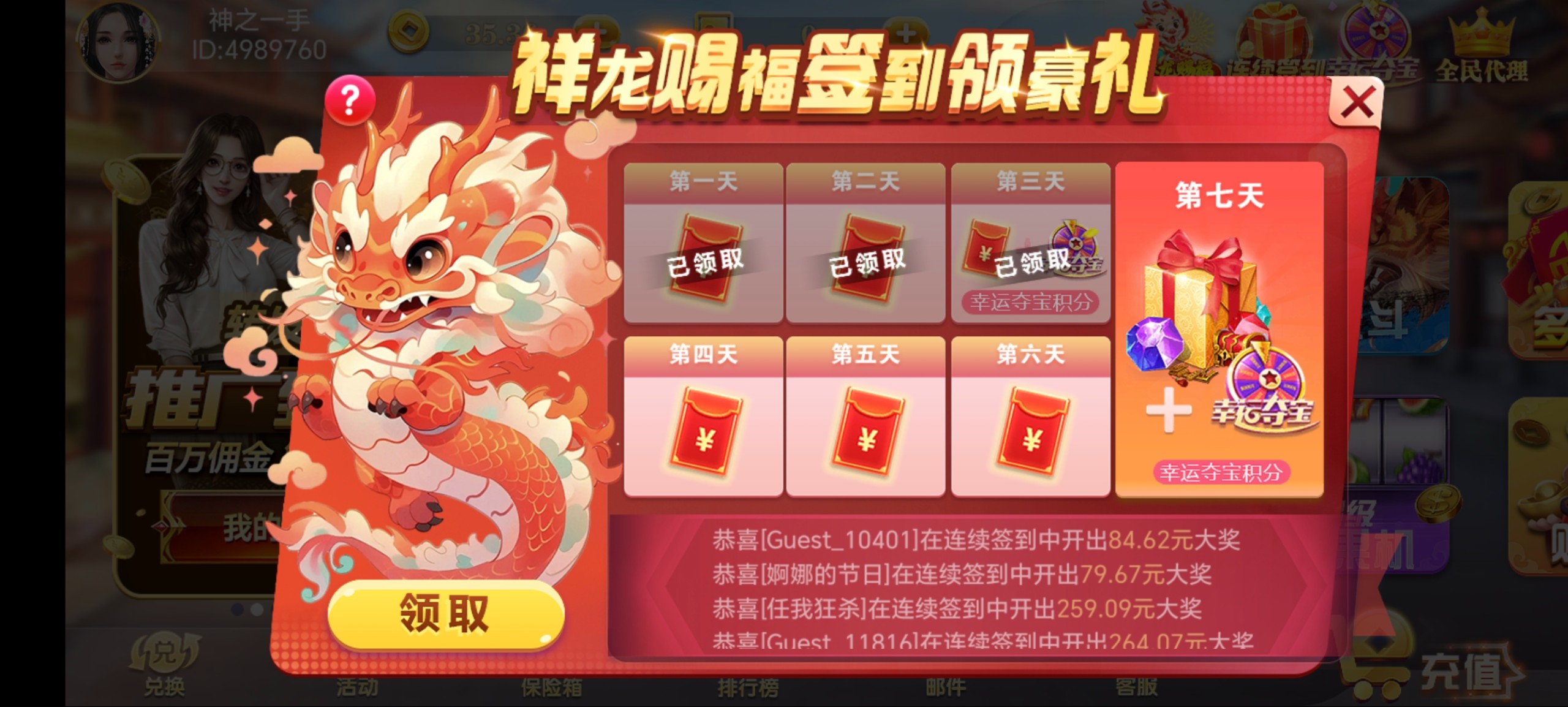 这个平台玩过的人挺多的,有号的上号看看能签到七天,我好久没充值了领了三十多三天了,应该是历史充值的越多领的越多吧
