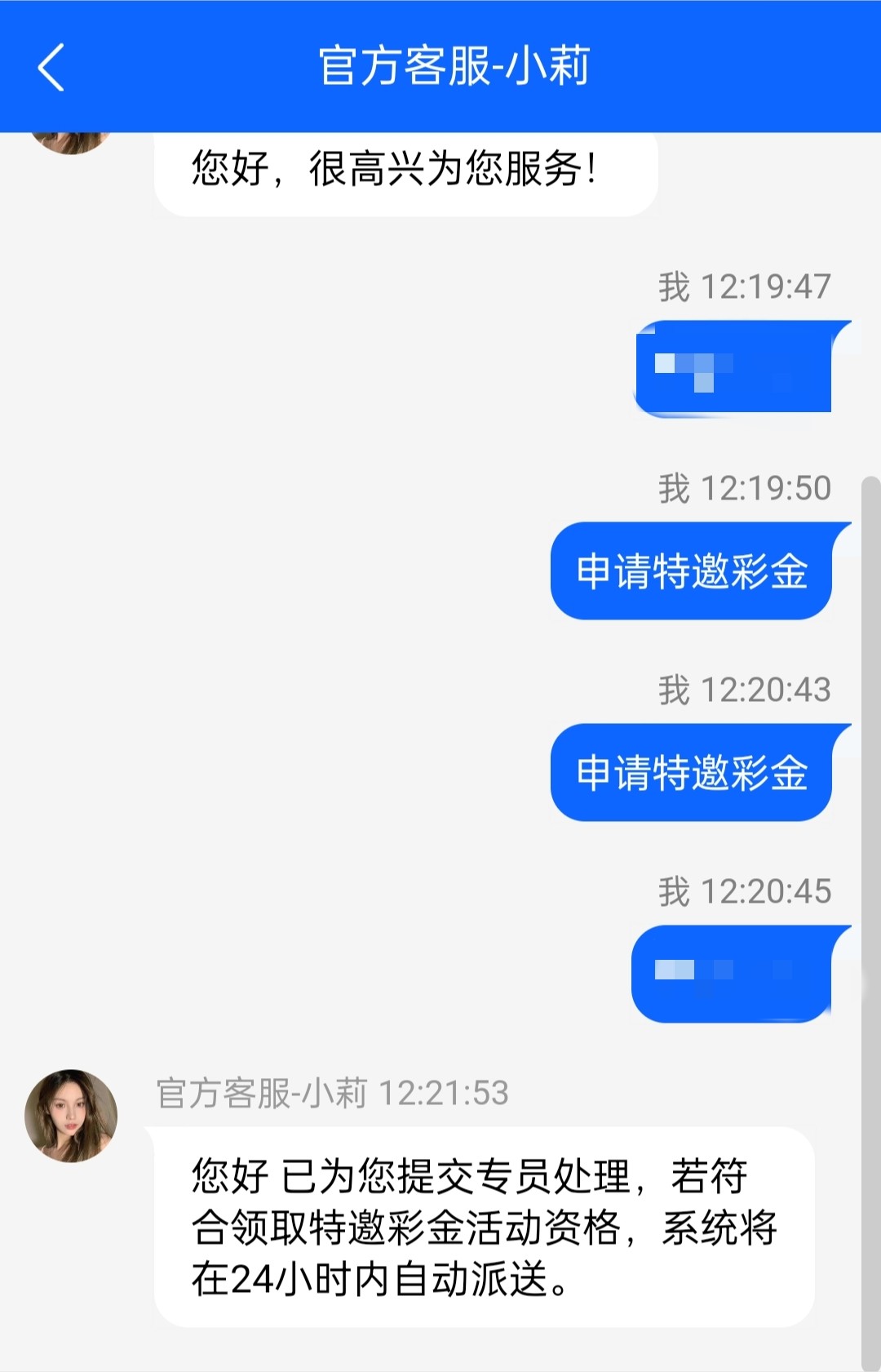 客服说特邀名单内24小时内自动赠送