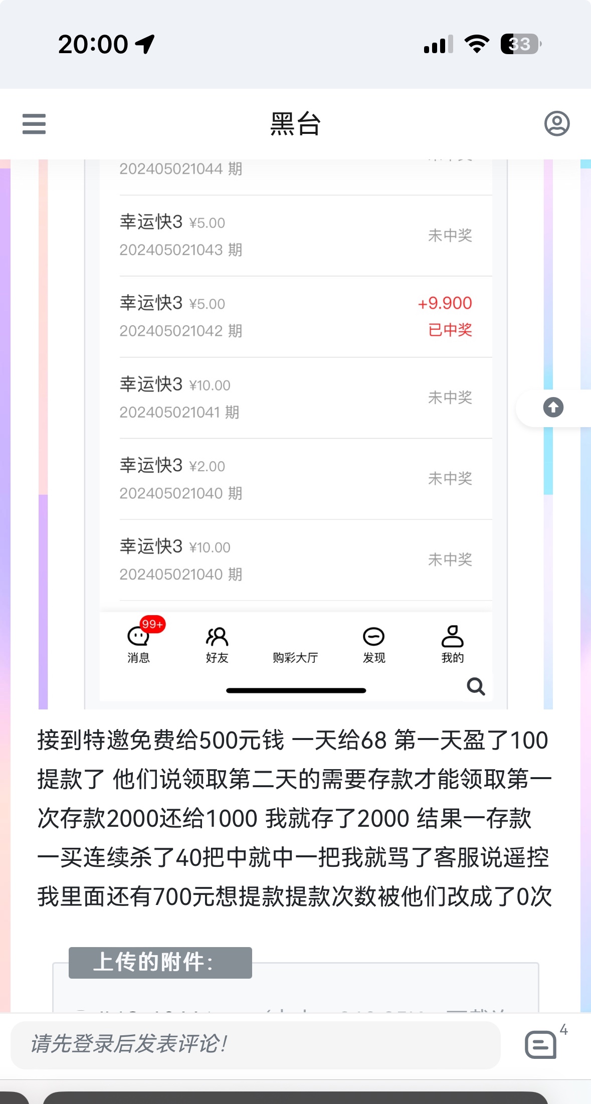 存款我想着第一次买啥就赢啥 提款了100还是免费的 存2000第一次还给一千 想着怎么都不会输 谁知道一上号被畜生设置杀了40把连续的中间就中一把 我跟客服说是不是遥控的 然后马上把我输剩的700元直接把提款次数改成0次 走之前还说在存300元可以提款走