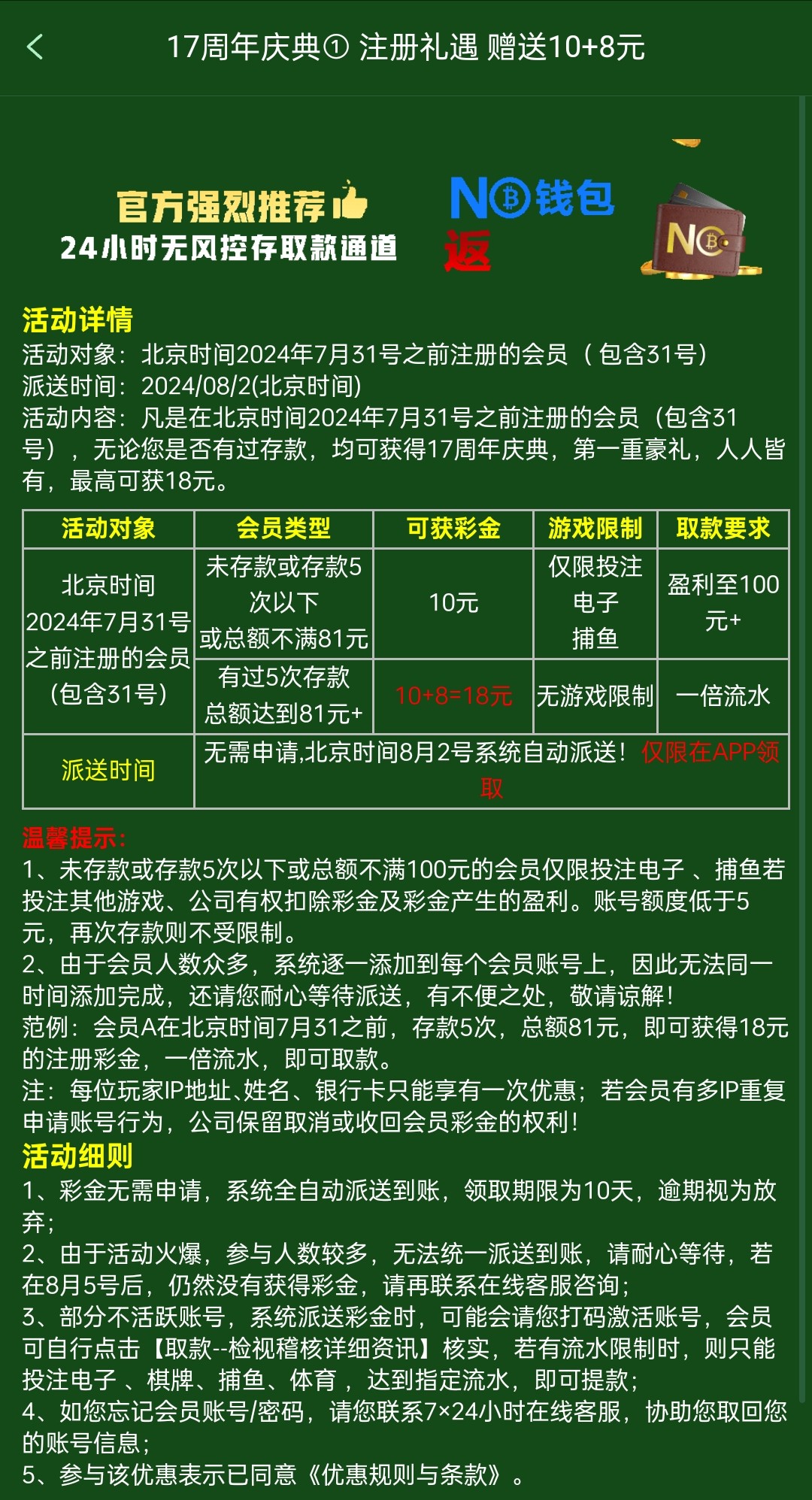 新人注册任务里面领18,7.31号之前注册8.2号回馈18