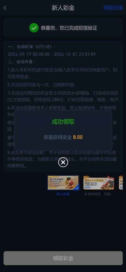 注册完善信息,优惠里面输入手机号自助申请次啊金,不是特邀的没有入口,在名单内秒到只能玩电子棋牌3倍流水!