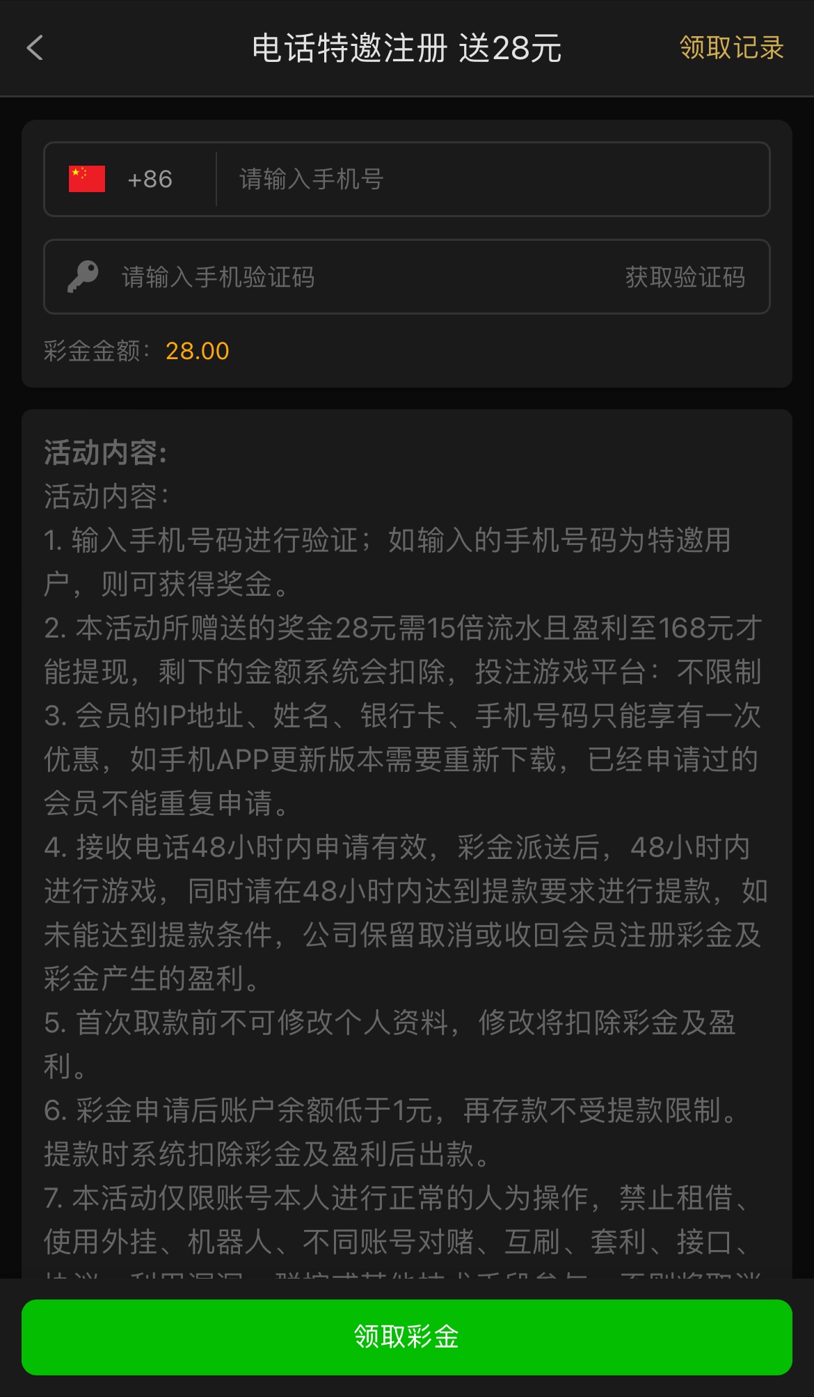 碰瓷短信电话特邀,短信特邀送18/电话特邀送28,15倍流水,只能提168