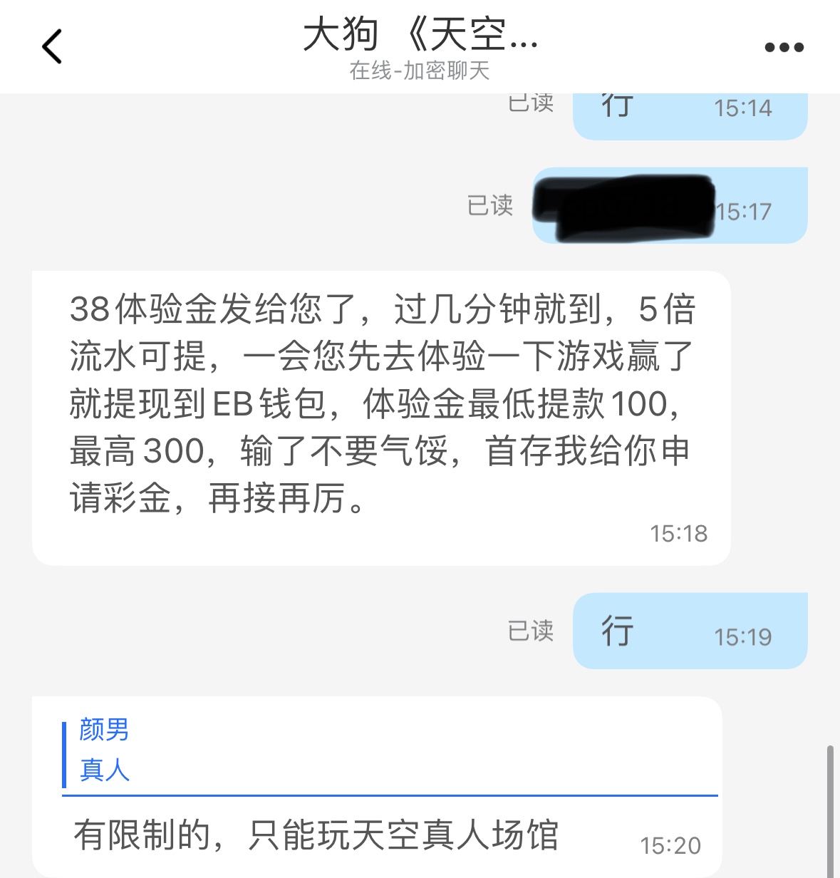 同意后他会给你发聊天软件,下载联系上面客服领取,5倍流水,最低100提现,体育.电竞.真人.棋牌.电子.彩票彩金,只能选择一个游戏场馆