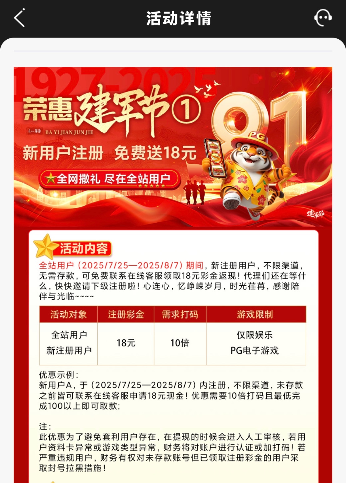 7.25-8.7号活动,新用户注册绑卡完善资料联系在线客服申请18/100提,彩金只能玩PG电子