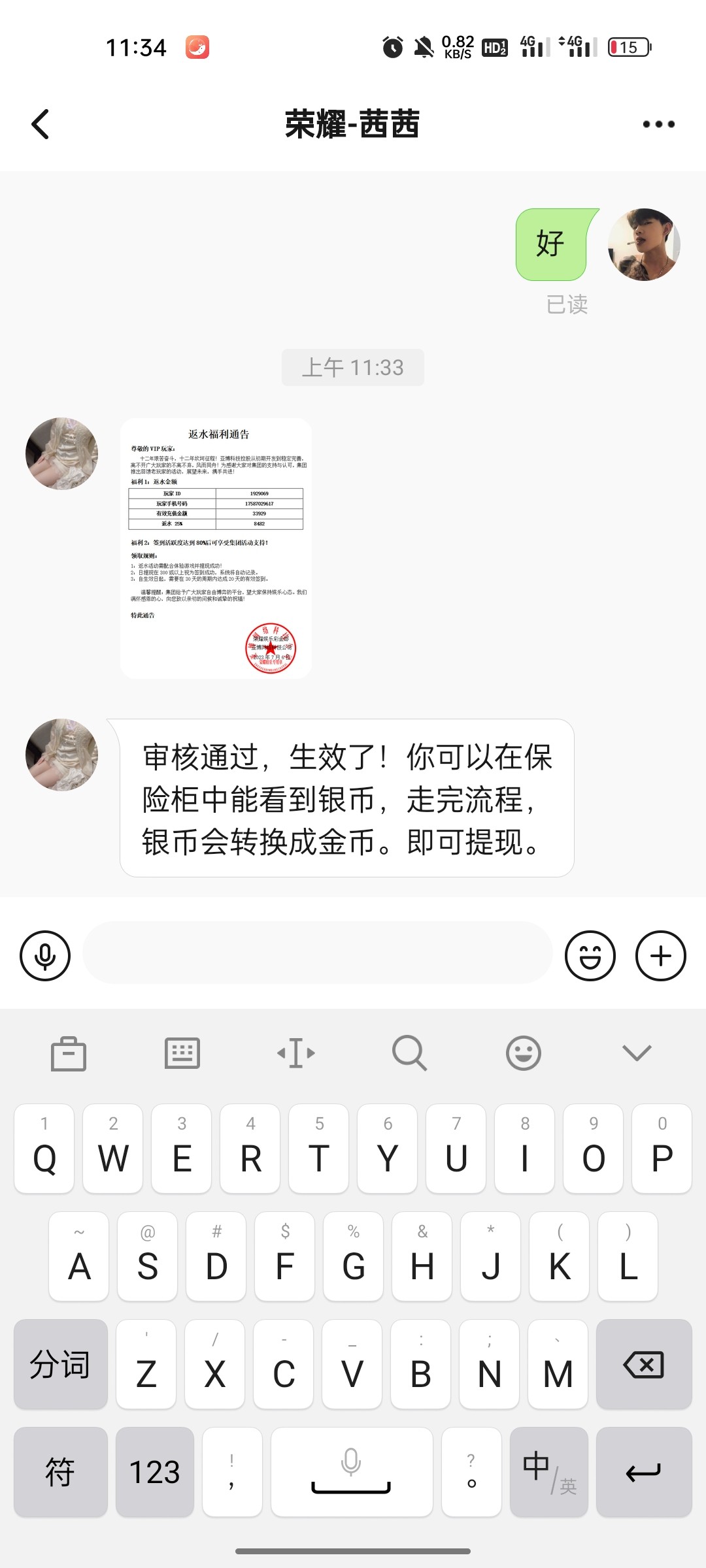 我接到电话,告诉我之前我在亚博充值过三万多,说返利百分之25,叫我下载荣耀娱乐绑定消息联系泡泡客服,最后申请到了,不能玩也不能提现,告诉我什么集团需要老玩家配合要有个提现记录,说白了就是叫充值,你们自己小心点接到电话说是亚博的什么什么就直接挂,这种就是骗子
