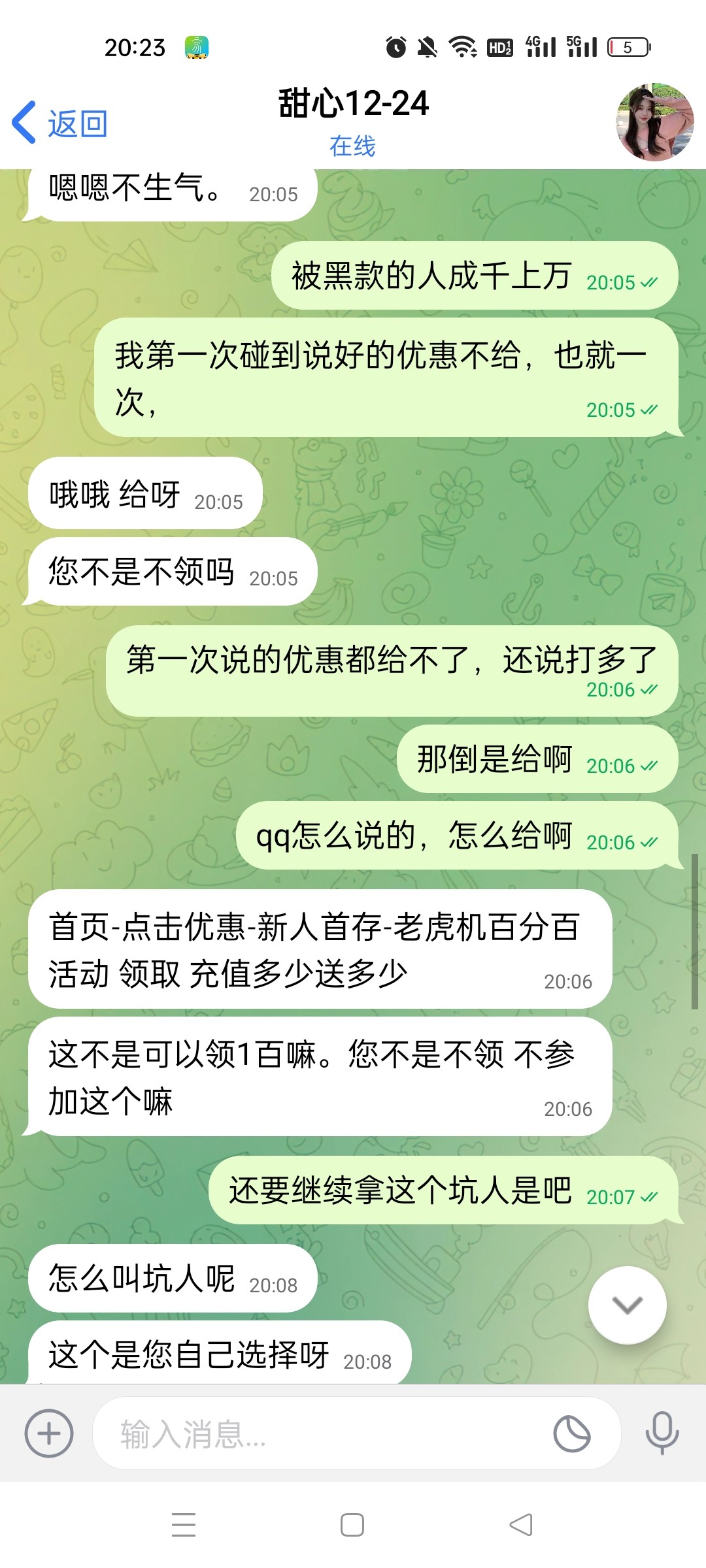 ,昨晚跟在线客服反馈,今天反馈几次都没结果昨晚就叫我继续加他,这种狗推。也是厉害,说的优惠一毛不送,还骂人,这里我他妈充了钱,就翻脸,理直气壮赖皮