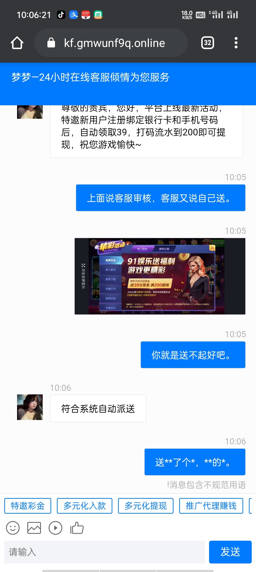 我问你是不是活不起了?特邀你都发出来。还有平台里面说人工审核。 客服又说系统送还有这他妈是特邀。他妈的,你要是没名单,人家做特邀干嘛?你个傻缺。