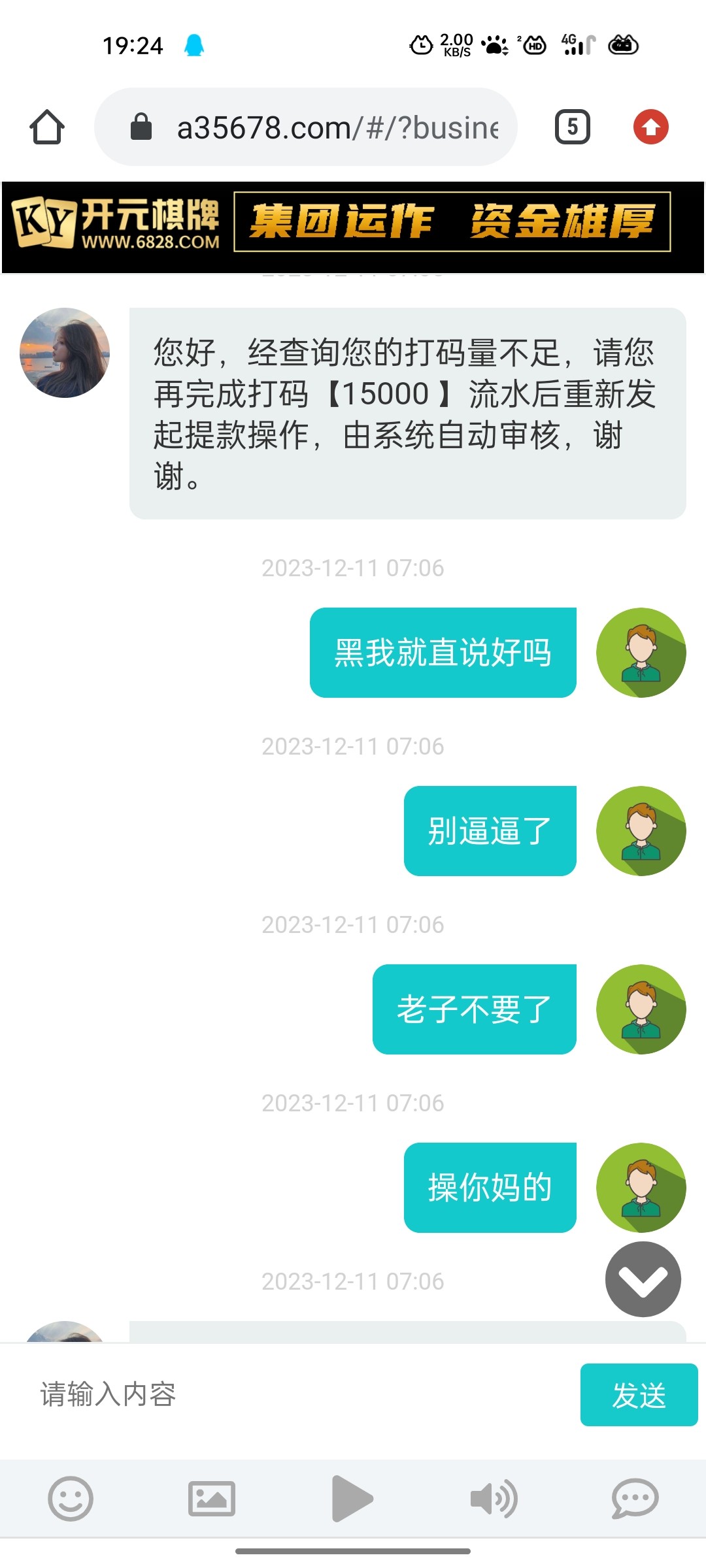 我领的 16 块礼金,正常玩,打到 1700 提现退回叫我打 8500 流水,现在 8500 流水打了又给我退回来,叫我打 15000 流水,这个台子真的是傻B 台,充多少杀多少,希望大家远离!开元 6828,以前网址叫 4441,垃圾的一批希望大家不要玩