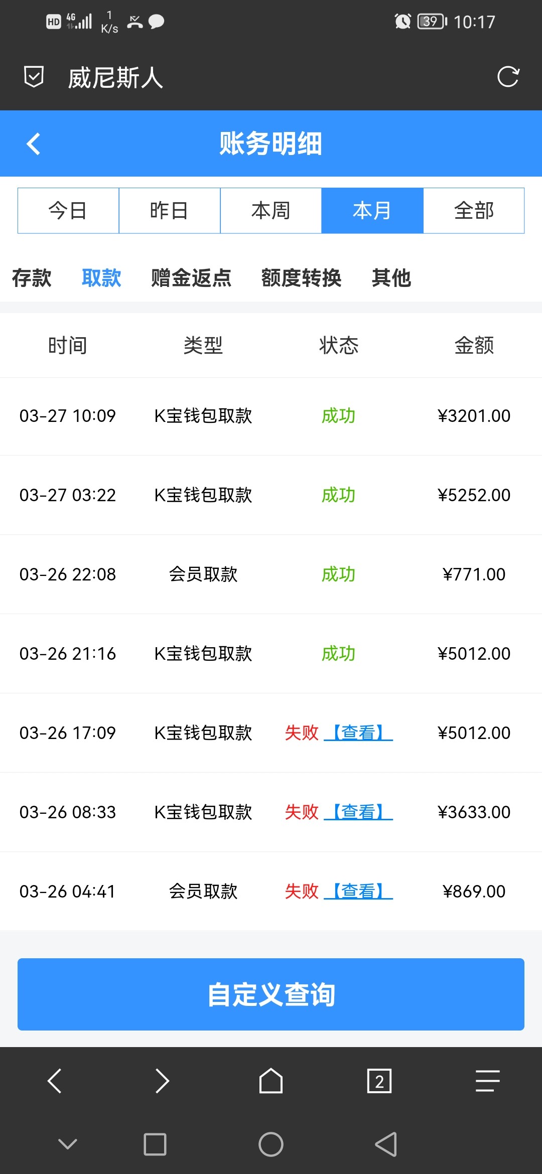 这台子提100用u提,不给,必须k宝,最后100打上900+用k宝给我来个注单异常,就是什么你都可以用,就是点出款过一会就失败,原因还是注单异常,然后输完了。另一个号提个100多随便到,司马台子