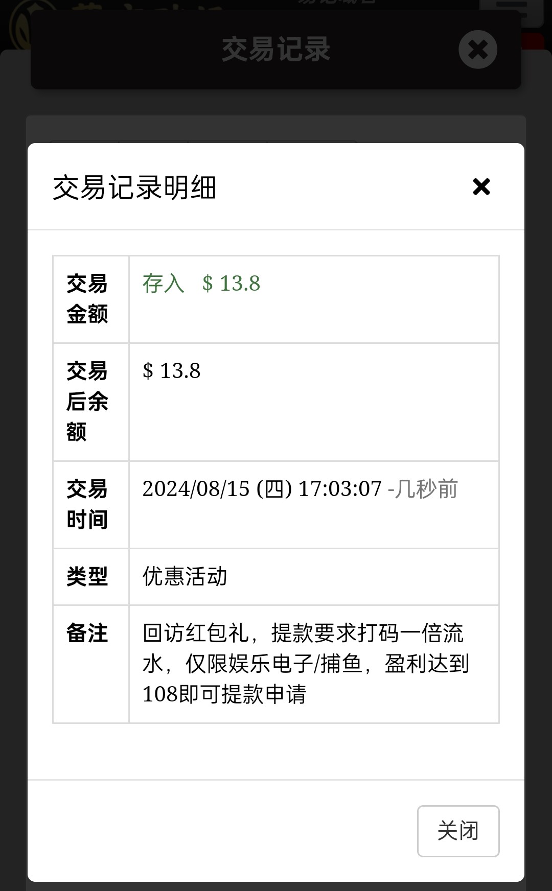 老用户有号的上号看看,登入上去会弹出来一个一键领取,要是没有的话就是没有!回访红包礼,提款要求打码一倍流水,仅限娱乐电子/捕鱼,盈利达到108即可提款申请