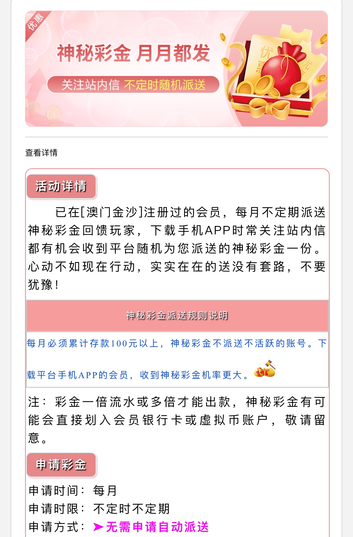 这个月的神秘彩金是第二波,这个月有存款过100以上的兄弟上号看看有没有,几个月没充值过的也可以上号看看有没有