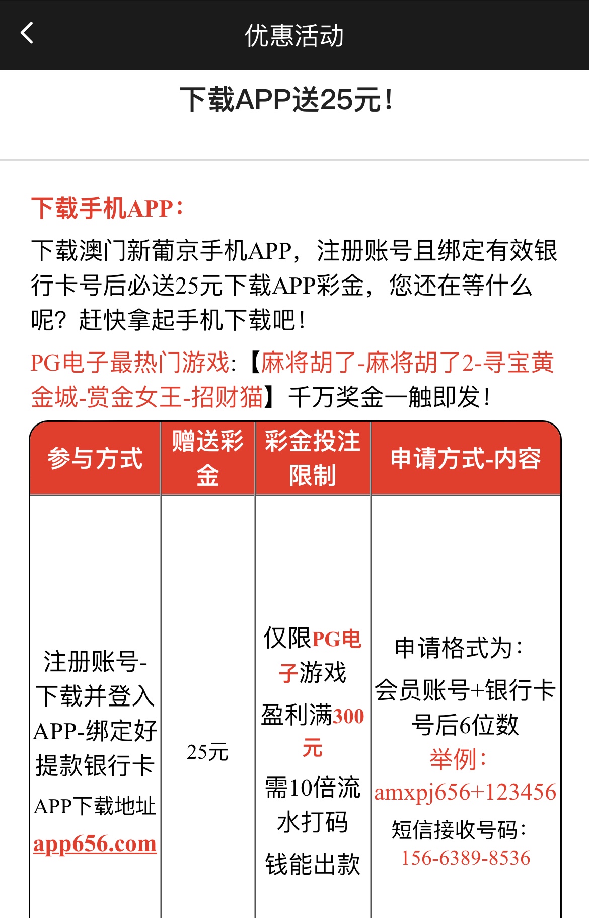 注册下载APP绑定银行卡,发短信送25,限PG电子,10倍流水,盈利满300,只能用钱能取款